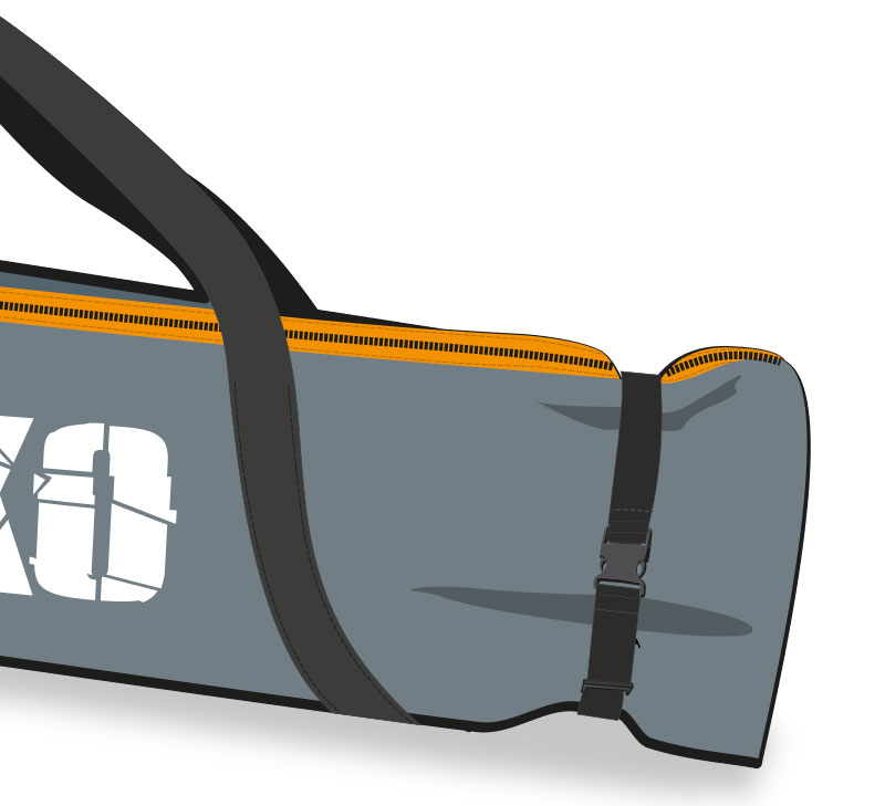 Una cinghia supplementare permette di avvolgere la sacca adattandola ad ogni formato di sci.